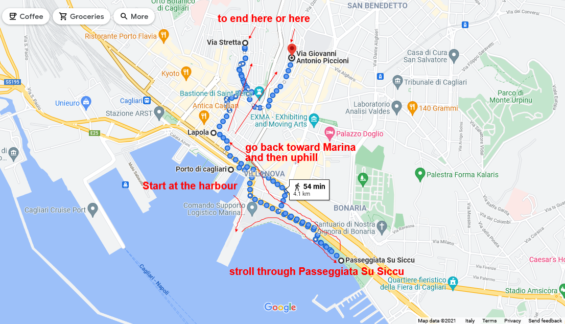 We recommend the use of Google Maps for finding your way, but be aware that there's a "secret" way to reach Passeggiata Su Siccu from the harbour that Google won't tell you about. Look at the pictures above, the red arrows will guide you.