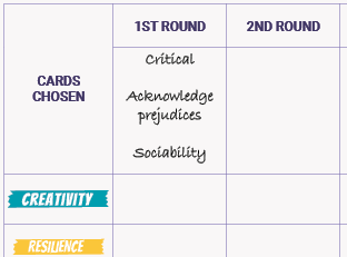 Invita entonces a los participantes a ir libremente a una de las 3 mesas/espacios disponibles y elegir la tarjeta con el elemento que creen que más han desarrollado durante el proyecto, hasta ese momento.