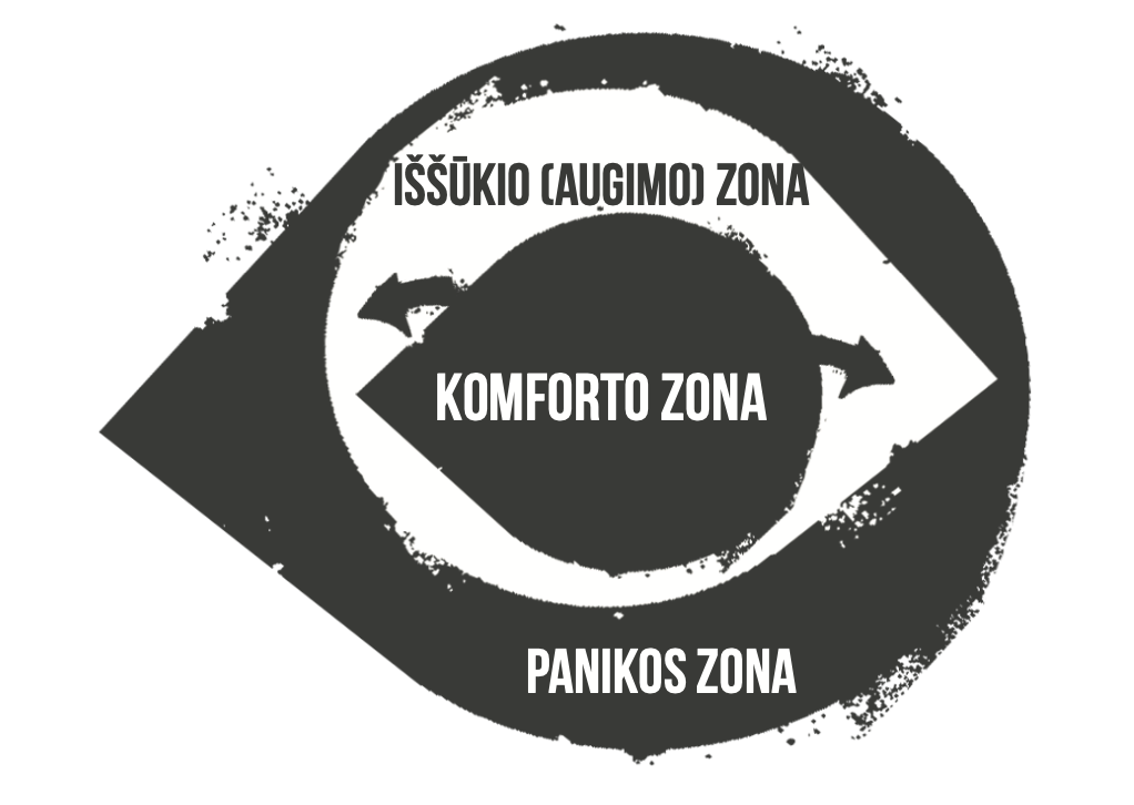 • Už iššūkio zonos egzistuoja panikos zona. Į ją patenkame tada, kai pervertiname savo jėgas ir galimybes arba tiesiog nevaldome stresinės situacijos. Panikoje mes prarandame kontrolę ir stengiamės kuo greičiau grįžti į komforto erdvę.